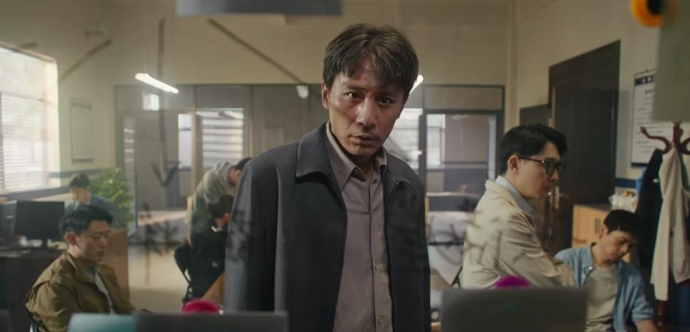 朱赫来独自伫立于档案室中央,手中紧攥战友遗照,四周是堆至天花板的牛皮纸袋。他未堕泪,未陨涕,仅仅右肩自若升沉,眼尾泛起湿润光泽,眼神从相片移向窗外灰蒙蒙的天光,再徐徐垂落——那刹那,28年积压的怨恨、自责与未熄的火种,全在睫毛低落的弧度里翻涌。